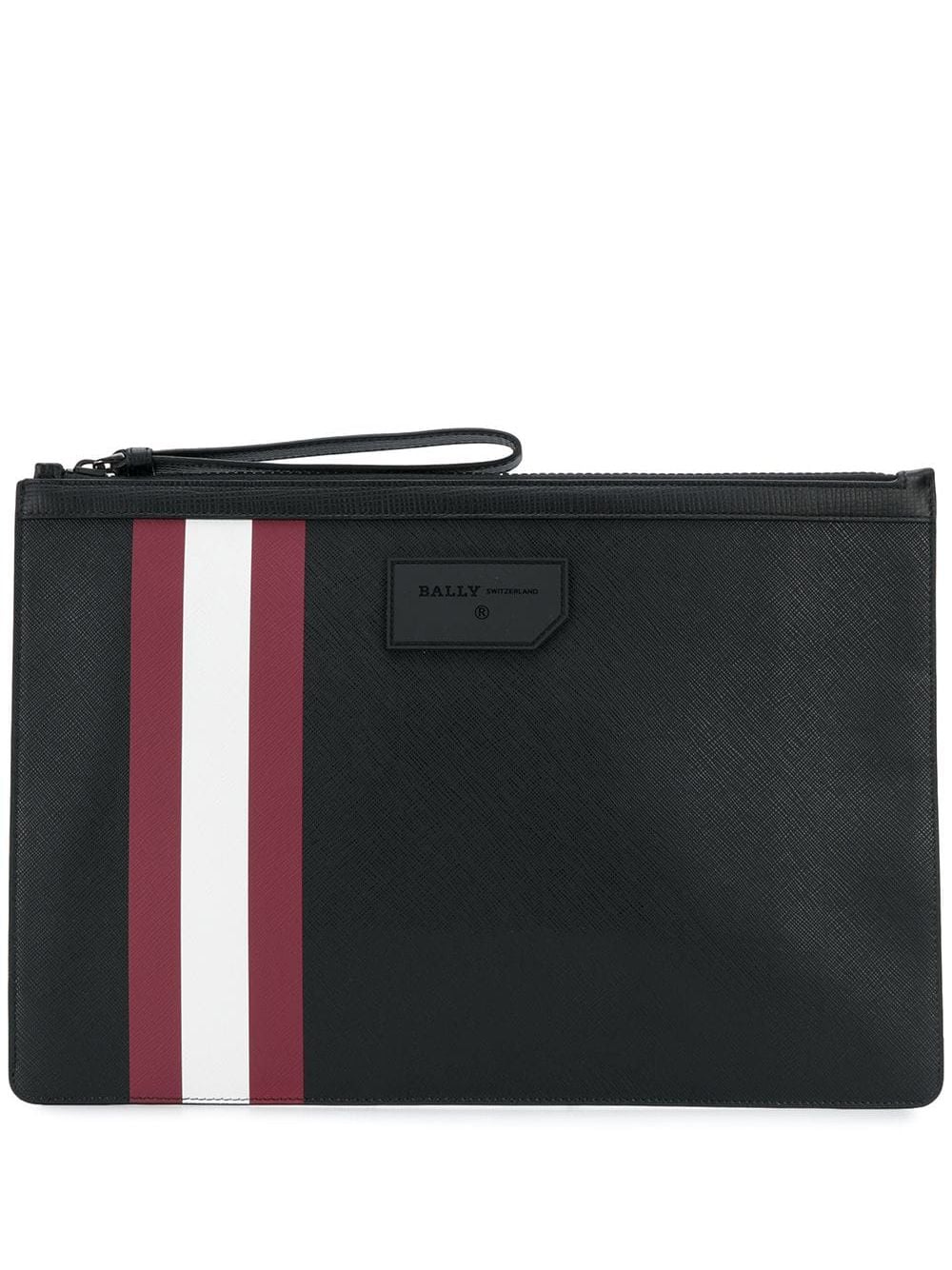 A fitting example of Bally’s trademark aesthetic, this stylish clutch bag features the infamous red and white stripe pattern inspired by the colours of the national flag depicted on moving Swiss trains. In a suitable black design, this accessory also showcases a wrist strap, a top zip closure and an embossed logo.