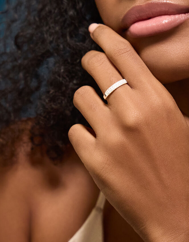 Designed in solid sterling silver, this ring is encrusted with two rows of cubic zirconia stones that endlessly sparkle. Bling, bling!